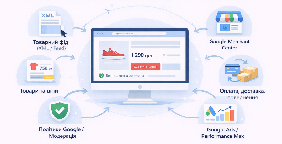- налаштування облікового запису Google Merchant Center, завантаження фіда та проходження модерації;