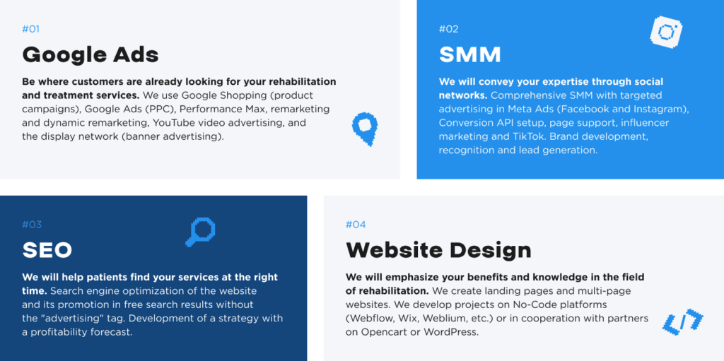The chosen procedure allowed us to first prepare the highest quality website possible, and only then direct our efforts to attract traffic. The preparation of the website required an analysis of both previous results and existing strong players in this market. We also paid active attention to the requests of potential clients of the rehabilitation center to understand what factors could convince them of the center’s expertise and increase their trust. The main areas we started working on promoting are: