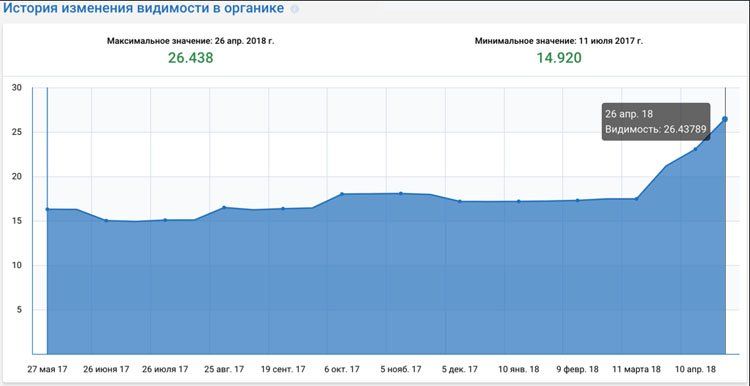 Видимость сайта выросла до 26.43, то есть, на 51% от первичного значения 17.45. В ТОП подтянулось много высокочастотных запросов, а также на несколько тысяч увеличилось значение ключевых слов в ТОП100.
